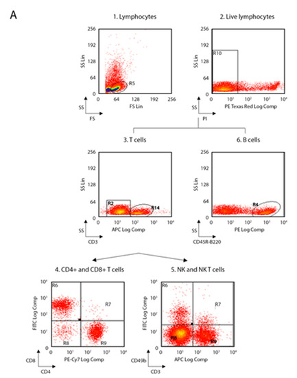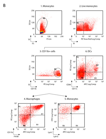 Flow-cytometry gating strategy used for spleen and lymph nodes. (A) Gating strategy for lymphocytes, NK and B cells; (1) FS versus SS gating was used to discriminate cells based on their size; (2) living cells were then identified by propidium iodide negativity; (3) CD3 was used as a T-cell marker; (4) CD3+ cells were distinguished based on the presence of CD4 and CD8; (5) NK and NK T were distinguished based on the presence of CD49b; (6) CD45R was used as a B-cell marker. (B) Gating strategy for macrophages, monocytes and DCs; (1) FS versus SS gating was used to discriminate cells based on their size; (2) living cells were then identified by propidium iodide negativity; (3–4) F4/80 gating on CD11b+ cells was used to select macrophages; (5) Ly6-C and Ly6-G gating on CD11b+ cells was used to select monocytes; (6) DCs were distinguished based on the presence of CD11c and CD86. (NK, natural killer; FS, forward scatter; SS side scatter; DCs, dendritic cells).