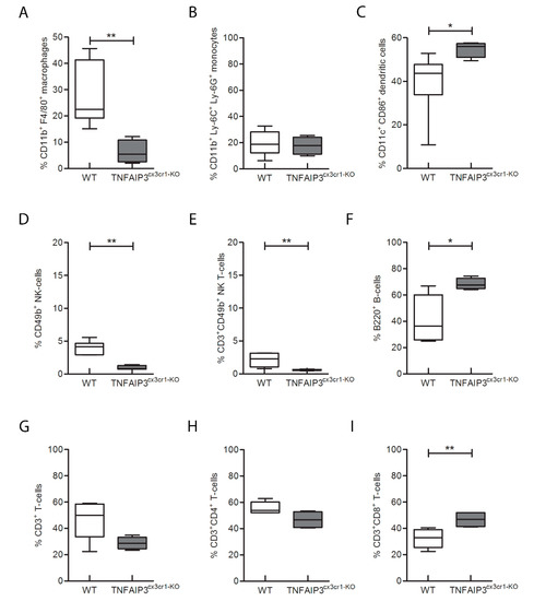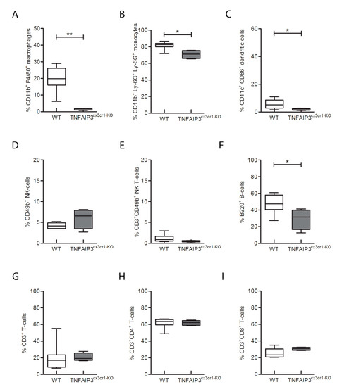 Flow-cytometry analysis performed on spleen obtained from 3 month-old WT and TNFAIP3cx3cr1-KO mice. The analysis reveals that the percentage number of CD11b+F4/80+ macrophages (A, p = 0.004), CD11b+Ly-6C+Ly-6G+ monocytes (B, p = 0.016), CD11c+CD86+ DCs (C, p = 0.048) and B200+ B (F, p = 0.048) cells is reduced in TNFAIP3cx3cr1-KO mice compared to their WT littermates. No differences are reported in CD49+NK (D, p = 0.214) and CD3+ CD49+NK T cells (E, p = 0.153) CD3+ T (G, p = 0.367), CD3+CD4+ T helper (H, p = 0.683) and CD3+CD8+ cytotoxic T cells (I, p = 0.109) (WT n = 8; TNFAIP3cx3cr1-KO n = 4) (Mann–Whitney test, ** p < 0.01; * p < 0.05). (DCs, dendritic cells; NK, natural killer).