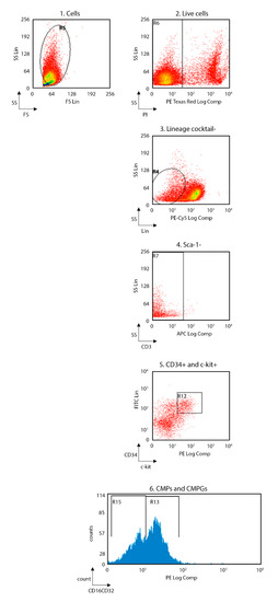 Flow-cytometry gating strategy used for bone marrow. Gating strategy for CMPs and CMGPs; (1) FS versus SS gating was used to discriminate cells based on their size; (2) living cells were then identified by propidium iodide negativity; (3) Lin- and (4) Sca-1- cells were gated based on the presence of (5) CD34 and c-kit; (6) CMPs and CMGPs were distinguished based on the presence of CD16CD32. (CMPs, common myeloid precursors; CMGPs, common monocyte and granulocyte precursor; FS, forward scatter; SS side scatter).