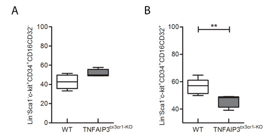 In order to evaluate whether the immunological alteration occurs during the development of immune cells or it is already present in the precursor cells, the flow-cytometry analysis was performed also in bone marrow of the same TNFAIP3cx3cr1-KO and WT mice (Figure 5 and Figure 6; WT n = 8, TNFAIP3cx3cr1-KO n = 4). Specifically, we investigated the consequences of TNFAIP3 ablation in the common myeloid precursors (CMPs, Figure 6A) and in the common monocyte and granulocyte precursor cells (CMGPs, Figure 6B). No differences were highlighted in the percentage number of the CMPs between WT and TNFAIP3cx3cr1-KO mice (Figure 6A, Mann–Whitney test p = 0.073). Conversely, the analysis revealed a decrease of CMGPs in TNFAIP3cx3cr1-KO mice compared to their WT littermates (Figure 6B, Mann–Whitney test p = 0.006).
