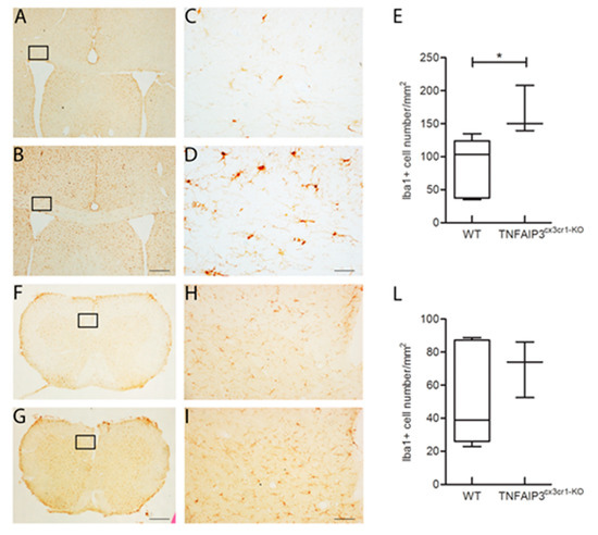 Ib1a+ microglial cells in the corpus callosum and in the spinal cord obtained from 3 month-old WT and TNFAIP3cx3cr1-KO mice. (A–D; F–I) Representative images of coronal section of corpus callosum (A–D) and spinal cord (F–I) of WT (A,C,F,H) and TNFAIP3cx3cr1-KO (B,D,G,I) mice immunostained with Iba1 antibody. Scale bar, 250 µm for A–B, F–G; 50 µm for C–D, H–I. (E,L) Quantitative analysis of the Iba1+ cell density in corpus callosum (E) and spinal cord (L) of WT and TNFAIP3cx3cr1-KO mice discloses an increased microglial cell density in the corpus callosum of TNFAIP3cx3cr1-KO mice compared to their WT littermates (E, p = 0.024). No differences are highlighted in the cervical spinal cord of TNFAIP3cx3cr1-KO mice compared to their WT littermates (L, p = 0.548). (WT n = 6; TNFAIP3cx3cr1-KO n = 3) (Mann–Whitney test, * p < 0.05). (Iba1, Ionized calcium binding adaptor molecule 1).