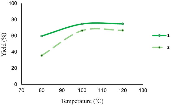 Dependence on the temperature for neat microwave (MW)-assisted oxidation of 1-phenylethanol using 1 or 2 as catalyst precursors. Reaction conditions: 5 mmol of substrate, 10 μmol (0.2 mol% vs. substrate) of 1 or 2, 10 mmol of TBHP (2 eq., 70% in H2O), MW irradiation (5–10 W), 30 min reaction time.