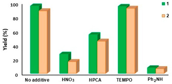The effect of different additives on the catalytic ability of complexes 1 and 2 was explored. Nitric acid (HNO3) and 2-pyrazinecarboxylic acid (HPCA), usually reported oxidation promotors [1,17,18], as well as 2,2,6,6-tetramethylpiperidine-1-oxyl radical (TEMPO) and diphenylamine (Ph2NH), were chosen to test the performances of 1 and 2 for the neat microwave-assisted peroxidative oxidation of 1-phenylethanol at the above optimized conditions (Figure 5). In the presence of HNO3, the yields of acetophenone decreased dramatically from 95.3% to 27.2% and 88.5% to 16.7% for 1 and 2, respectively (Table 3, entries 9 and 29). An inhibiting effect was also observed in the presence of the heteroaromatic acid HPCA (pyrazine-2-carboxylic acid), leading to a decrease of acetophenone yields to 54.8% and 45.6%, for 1 and 2, respectively (entries 10 and 30 of Table 3, respectively). These results suggest that the acid could break the chloro bridges, causing complexes to loss their structure and inherent reactivity.