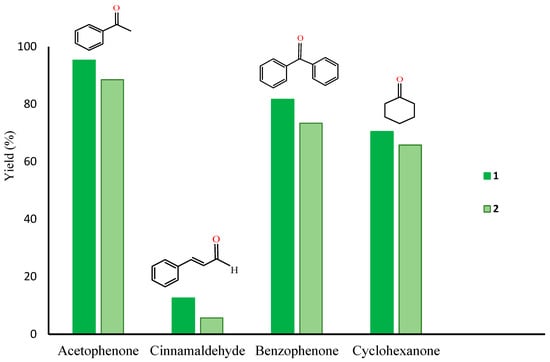 The selective catalytic oxidations of cinnamyl alcohol, benzhydrol, and cyclohexanol were tested under the optimized reaction conditions found for 1-phenylethanol. Lower yields of the corresponding ketones or aldehyde were achieved when compared with the obtained values for acetophenone (Figure 6). Moreover, whereas in presence of complex 1, TEMPO influence was not detected for the oxidation of cinnamyl alcohol, benzhydrol, or cyclohexanol after 1 h at 100 °C under MW irradiation (see Table 3, entries 13, 16, and 19, respectively), TEMPO had a slightly promoting effect when 2 was used, leading to increases of 5.7% to 7.2% for cinnamaldehyde, 73.4% to 79.8% for benzophenone, and 65.8% to 67.9% for cyclohexanone (entries 33–38, Table 3).