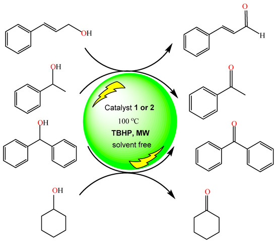 Microwave-assisted neat oxidations of cinnamyl alcohol, 1-phenylethanol, benzhydrol, and cyclohexanol to cinnamaldehyde, acetophenone, benzophenone, and cyclohexanone, respectively, catalyzed by 1 or 2 using aq. tert-butyl hydroperoxide (ButOOH, TBHP, 70% aq. solution).