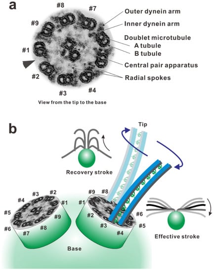 - Ishikawa, T. Axoneme structure from motile cilia. Cold Spring Harb. Perspect. Biol. 2017, 9, a028076. [Google Scholar] [CrossRef]
