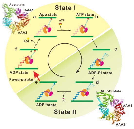 - Roberts, A.J.; Numata, N.; Walker, M.L.; Kato, Y.S.; Malkova, B.; Kon, T.; Ohkura, R.; Arisaka, F.; Knight, P.J.; Sutoh, K.; et al. AAA+ ring and linker swing mechanism in the dynein motor. Cell 2009, 136, 485–495. [Google Scholar] [CrossRef]