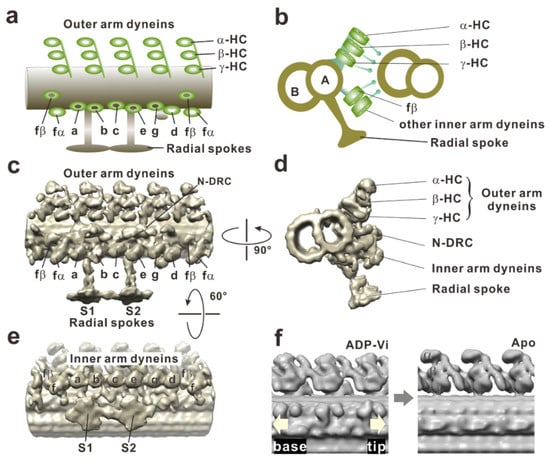 - Bui, K.H.; Sakakibara, H.; Movassagh, T.; Oiwa, K.; Ishikawa, T. Molecular architecture of inner dynein arms in situ in Chlamydomonas reinhardtii flagella. J. Cell Biol. 2008, 183, 923–932. [Google Scholar] [CrossRef]