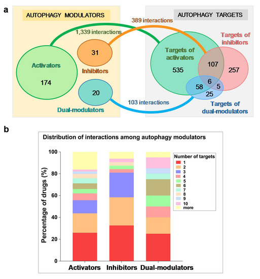 Based on DrugBank v5.1.1, we identified a total of 1831 types of known drug–target interactions between these autophagy modulators and their target proteins. Specifically, the activators, inhibitors, and dual-modulators were involved in 1339, 389, and 103 known interactions with their targets (Figure 1a).