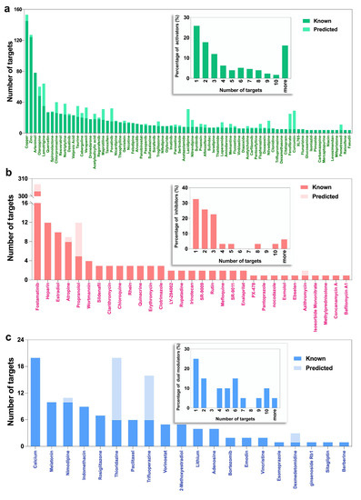 Promiscuity of autophagy modulators. (a) The number of known and predicted targets of activators; (b) The number of known and predicted targets of inhibitors; (c) The number of known and predicted targets of dual-modulators. The drugs are ranked in a descending order of the number of known targets. The contributions of the known and predicted drugs to the total number of targets are shown by the dark and light colors as indicated by the labels. See also Figure S3 for additional data on activators. Insets: Percent distribution of modulators vis-à-vis their promiscuity. The promiscuity is quantified by the degree of each modulator, i.e., the number of targets (abscissas) associated with the modulator.