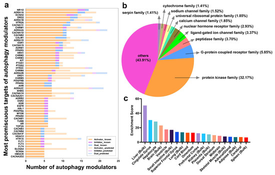 An overview of proteins targeted by autophagy modulators. (a) Frequent targets of autophagy activators (orange), inhibitors (violet), and dual-modulators (blue), ranked by the number of the total known targets in descending order. In light shades are those predicted by our probabilistic matrix factorization (PMF) method. (b) Distribution of targeted proteins by protein families; (c) Tissues enriched in targets of autophagy modulators.