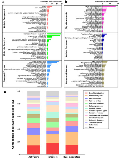 Gene ontology (GO) annotation and pathway enrichment analysis results based on the targets of autophagy modulators. (a) Enriched GO annotation terms; (b) Enriched KEGG pathways; (c) most common pathways in which autophagy targets take part. The distribution of pathway subclasses targeted by autophagy modulators are shown for each category of autophagy modulators. Note the dominance of signal transduction (red) and endocrine (orange) systems in all categories, the important association of inhibitors with cancers and, to some extent, infectious diseases, and the preferential use of activators and dual modulators in treating neural diseases.