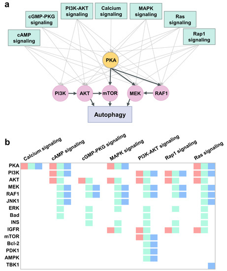 Overall, this analysis draws attention to the central role of PKA as a mediator of ATG signal transduction events. PKA regulates three key players, mTOR, MEK, and Raf1, which in turn regulate autophagy (Figure 5a). We also note the critical role of PI3K that regulates AKT, which in turn regulates mTOR. We next constructed a comprehensive model of an ATG signal transduction network that provides an integrated view of these complex interactions.