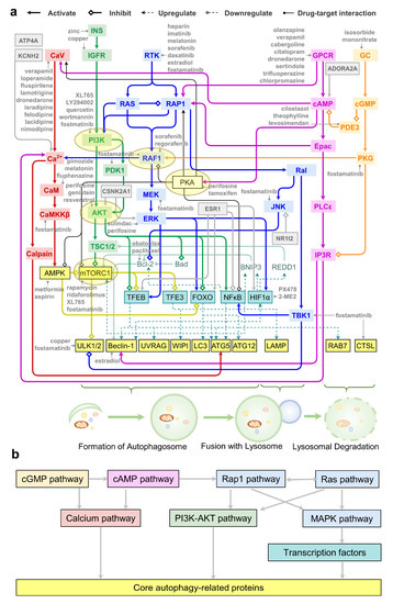 A network of pathways connecting intracellular signal transduction events to autophagy modulation. (a) A unified signaling network mediates the effects of autophagy modulators on signaling transduction; (b) The regulatory dependency of signaling transduction modules. Color coding: calcium signaling (red), cAMP signaling (violet), cGMP-PKG signaling (orange), Rap1/Ras/MAPK signaling (blue), PI3K-AKT signaling (green), core autophagy proteins (yellow), and transcription factors (cyan). The core autophagy proteins were grouped (indicated by braces) by their roles in regulating three phases of autophagy: formation of autophagosome, fusion with lysosome, and lysosomal degradation. The key ATG-signal transduction proteins shown in Figure 5a (except MEK) are highlighted by the yellow ellipses. Selected modulators of key targets are listed in gray font. See the code for different types of actions indicated by arrow ends on top.