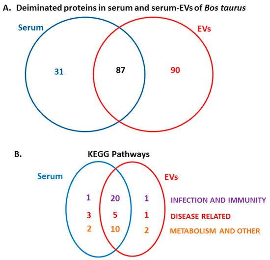 Criscitiello, M.F.; Kraev, I.; Lange, S. Post-Translational Protein Deimination Signatures in Serum and Serum-Extracellular Vesicles of Bos taurus Reveal Immune, Anti-Pathogenic, Anti-Viral, Metabolic and Cancer-Related Pathways for Deimination. Int. J. Mol. Sci. 2020, 21, 2861. https://doi.org/10.3390/ijms21082861