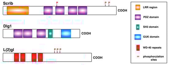 Scrib, Dlg1, and L(2)gl are all cytoplasmic, membrane-associated proteins that co-localize to the baso-lateral domain of epithelial cells. Scrib and Dlg1 are multi PDZ (PSD-95/Dlg1/ZO-1) domain-containing proteins that act as scaffolds, whereas L(2)gl is a non-muscle myosin II binding protein with WD-40 repeats and, unlike Scrib and Dlg1, is cortically uniform (Figure 1) [,,,,,].