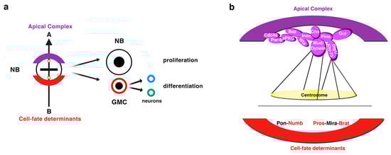 Drosophila neuroblasts (NBs), the neural stem cells of the central nervous system (CNS), divide asymmetrically. (a) NBs divide asymmetrically to give rise to another NB and a ganglion mother cell (GMC), which receives the cell-fate determinants that induce a differentiation program in this cell. The GMC divides asymmetrically through a terminal division to give rise to two different neurons of glial cells. The sibling NB that does not receive the cell-fate determinants keeps on dividing. A group of proteins apically located at the cortex of metaphase NBs (the “apical complex”) is in turn crucial for the basal sorting of the cell-fate determinants, as well as for the correct orientation of the mitotic spindle along an apico-basal axis of cell polarity previously established. (b) A diagram showing the most representative components of the apical complex and the cell-fate determinants Numb, Pros and Brat. Pon and Mira are adaptor proteins of Numb (Pon) and of Pros and Brat (Mira) (modified from Carmena, Fly, 2018).