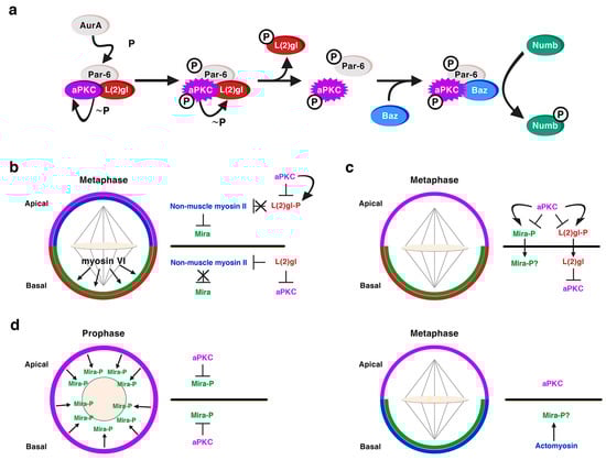 A role for the neoplastic TSGs of the Scribble module in asymmetric NB division was first shown for Dlg1 and L(2)gl [,]. Dlg1 and L(2)gl were found to be essential for the basal targeting of the cell-fate determinants Numb and Pros, as well as of their adaptor proteins Partner of Numb (Pon) and Miranda (Mira), respectively, in both embryonic and larval mitotic NBs [,]. However, Dlg1 and L(2)gl were dispensable for the localization of apical proteins, such as Baz, Insc or Pins and for the orientation of the mitotic spindle [,]. Dlg1 was required for the cortical localization of L(2)gl, which became cytoplasmic in dlg1 mutant embryos; however, L(2)gl was not necessary for the localization of Dlg1. Hence, it was proposed that, at least for its localization, although not necessarily for its function, Dlg1 would act upstream of L(2)gl [,]. In fact, we now know that L(2)gl acts functionally upstream of Dlg1 []. Both proteins are distributed predominantly at the cortex, although, at metaphase, Dlg1 is apically enriched while L(2)gl is phosphorylated and inactivated by aPKC at this location []. This is promoted by Aurora-A (AurA) kinase, which at metaphase phosphorylates Par-6 with the consequent activation of aPKC. Activated aPKC phosphorylates and inactivates L(2)gl, which leaves the apical complex and it is replaced by Baz/Par-3 [,]. Baz, then, allows the phosphorylation of the cell-fate determinant Numb by aPKC, and the consequent exclusion of P-Numb to the basal pole of the NB [] (Figure 4a). The inhibition of L(2)gl by aPKC is mutual, as L(2)gl represses aPKC basally, restricting it to the apical cortex [] (Figure 4b,c). Thus, the localization of at least some apical proteins, such as aPKC, do depend on some of the TSGs of the Scribble module. L(2)gl also binds and represses non-muscle myosin II heavy chain, called Zipper in Drosophila, at interphase. At metaphase, when L(2)gl is inactivated by aPKC, it was proposed that myosin II becomes active and, in turn, promotes the cortical exclusion of the cell-fate determinant adaptor protein Mira from the apical NB cortex (Figure 4b) [,]. The basal targeting of Mira would occur by passive diffusion throughout the cytoplasm, not by active transport, and it would depend on another myosin, myosin VI, Jaguar in Drosophila, which would be essential for the final localization of Mira in a basal crescent (Figure 4b) [,]. Yet, the role of myosin II in Mira localization (Figure 4b) was questioned and the model to explain Mira asymmetry was replaced by another one some years ago []. This latter work showed that aPKC can directly phosphorylate Mira at several sites to exclude it from the apical cortex independently of L(2)gl, which would be antagonizing aPKC activity (Figure 4c) [,]. More recently, additional data seem to point to an integrated view of both models []. Thus, aPKC direct phosphorylation of Mira, event that occurs at prophase, would not be the only mechanism that regulates Mira asymmetry, and an actomyosin-dependent mechanism would be additionally required to maintain Mira asymmetric localization at metaphase (Figure 4d) [,].