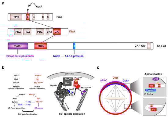 Regarding Dlg1, over the past 20 years, since it was first described in the process of NB asymmetric division [,], we have substantially increased our knowledge about the mechanisms underlying Dlg1 function in this context. The guanylate kinase (GK) domain of Dlg1/DLG1 (Figure 5a), a phosphoprotein recognition motif, binds the Pins/LGN linker domain (PinsLinker) both in Drosophila and in mammals [,,]. This conserved PinsLinker domain must be phosphorylated by the mitotic kinase AurA to physically interact with the Dlg1 GK domain [], which in turn recruits the motor protein Khc-73. This kinase first interacts through its MAGUK binding stalk (MBS) domain (Khc-73MBS) with the GK motif of Dlg1 at the cortex, and then with astral microtubule plus-ends through its motor domain (Khc-73motor) (Figure 5a). This Pins-Dlg1-Khc73 pathway mediates a microtubule-induced Pins-Gαi (the latter is bound to the GoLoco domains of Pins, see above and Figure 2) cortical polarity at metaphase NBs, independently of the Par complex []. However, this pathway is not enough for a full orientation of the mitotic spindle. Pins must activate another microtubule motor pathway mediated by Dynein that interacts with minus-end astral microtubules. The PinsTPR domain is the motif involved in the activation of this pathway by binding Mud/NuMA, which in turn associates with Dynein that exerts pulling forces on microtubules. Both PinsTPR- and PinsLinker-mediated pathways are required and act synergistically to promote a robust spindle alignment []. The mechanism by which these Pins-mediated pathways interact was identified some years ago [] (Figure 5b). In this work, authors show how the Drosophila 14-3-3ζ protein associates to the 14-3-3 binding motif present in the Khc-73 C-terminal stalk, (Figure 5a). The NudE Dynein cofactor [,] interacts in turn with 14-3-3ε, which forms a heterodimer with 14-3-3ζ. This complex 14-3-3ζ/14-3-3ε/NudE acts then as the bridge between both Pins-mediated pathways to allow a full, optimal spindle orientation (Figure 5b) []. More recently, Dlg1 has been shown to be phosphorylated in its SH3 domain by aPKC [] (Figure 5c). This phosphorylation releases an auto-inhibitory intramolecular interaction between Dlg1 SH3 and the GUK domains. In this situation, the spindle orientation factor Gukh can bind to the Dlg1 GUK domain and to astral microtubules, contributing, along other Dlg1 effectors such as Khc-73, to Dlg1-mediated spindle alignment (Figure 5c).