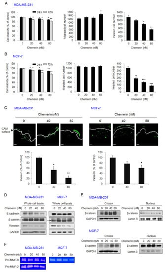 Chemerin suppressed the viability, invasion, and epithelial–mesenchymal transition (EMT) of breast cancer cells. (A,B) The viability, migration, and invasion of (A) MDA-MB-231 or (B) MCF-7 breast cancer cells treated with chemerin. Cell viability was measured by an 3-(4,5-dimethylthiazol-2-yl)-2,5-diphenyltetrazolium bromide (MTT) assay after 24 h and 72 h of treatment with chemerin. Cell migration or invasion was measured using a Transwell chamber and determined by counting the number of migrated or invaded breast cancer cells 8 h or 24 h after chemerin treatment. (C) In ovo invasion of chemerin-treated MDA-MB-231 or MCF-7 cells. CFDA-SE-labeled MDA-MB-231 or MCF-7 cells were loaded onto the chorioallantoic membrane (CAM) of fertilized eggs (n = 4) and incubated for 72 h. The images were collected using a Zeiss LSM 700 confocal microscope and analyzed using ImageJ software. Representative images (upper). Scale bar, 100 μm. Cell invasion was determined by measuring the mean fluorescence of cells that had invaded below the CAM surface (lower); (D) The expression levels of EMT markers and (E) the nuclear and cytosolic levels of β-catenin in MDA-MB-231 or MCF-7 cells treated with chemerin for 24 h. The expression level of E-cadherin, β-catenin, or vimentin in the whole cell lysate and the nuclear and cytosolic levels of β-catenin were detected using Western blotting. Representative images; (F) The levels of pro matrix metalloproteinase (MMP)-2 and pro MMP-9 secreted from MDA-MB-231 or MCF-7 cells treated with chemerin for 24 h. The levels of pro MMPs in the collected conditioned media were determined by gelatin zymography. The clear zones in representative images indicate the gelatinolytic activity of the MMPs. Data are expressed as the mean ± SEM. * p < 0.05, ** p < 0.01, *** p < 0.001 versus cells without chemerin.