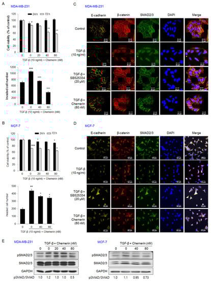 TGF-β and IGF-1 are known to induce EMT and the invasion of cancer cells. In particular, TGF-β and IGF-1 released from resorbed bone matrix stimulate the growth and invasion of bone metastases in bone microenvironment [,]. TGF-β treatment for 72 h showed a tendency to reduce the viability of MDA-MB-231 cells. Treatment with 80 nM chemerin for 72 h reduced the viability of TGF-β-treated MDA-MB-231 cells by 32%. Cell invasion was increased by 1.49-fold by TGF-β treatment for 24 h, but the increase in cell invasion by TGF-β was inhibited by 29% and 63% by treatment with 40 nM and 80 nM chemerin, respectively (Figure 2A). In MCF-7 cells, treatment with TGF-β alone or together with 80 nM chemerin reduced cell viability by 28% and 36%, respectively. Cell invasion was increased by 2.23-fold by TGF-β treatment, but TGF-β-stimulated cell invasion was inhibited by 18% and 22% by treatment with 40 nM and 80 nM chemerin, respectively (Figure 2B). Confocal images of immunostained MDA-MB-231 (Figure 2C) and MCF-7 cells (Figure 2D) indicated that TGF-β treatment downregulated the expression of E-cadherin and stimulated the nuclear translocation of β-catenin and SMAD2/3. Treatment with SB525334 (TGF-β type I receptor inhibitor) or chemerin rescued the expression of E-cadherin detected along the plasma membranes and inhibited the translocation of β-catenin and SMAD2/3 into the nucleus in TGF-β-treated breast cancer cells. In addition, Western blot analysis indicated that chemerin treatment inhibited the phosphorylation of SMAD2/3 in TGF-β-stimulated breast cancer cells (Figure 2E).