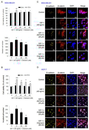 Treatment with insulin-like growth factor (IGF)-1 for 72 h increased the viability of MDA-MB-231 cells by 1.24-fold, but 80 nM chemerin treatment reduced the IGF-1-induced increase in viability by 14%. Cell invasion was increased by 1.17-fold in MDA-MB-231 cells by IGF-1 treatment for 24 h, but the effect of IGF-1 on MDA-MB-231 cell invasion was reduced by 16% and 29% by treatment with 40 nM and 80 nM chemerin, respectively (Figure 3A). IGF-1 treatment for 72 h increased the viability of MCF-7 cells by 1.99-fold, but treatment with 80 nM chemerin reduced the IGF-1-induced increase in cell viability by 28%. Cell invasion was increased by 1.48-fold in IGF-1-treated MCF-7 cells after 24 h, but IGF-1-induced cell invasion was inhibited by 24% and 54% by treatment with 40 nM and 80 nM chemerin, respectively (Figure 3B). In MDA-MB-231 (Figure 3C) and MCF-7 cells (Figure 3D), immunofluorescence images showed that IGF-1 treatment reduced E-cadherin expression and stimulated nuclear translocation of β-catenin. Treatment with ZSTK474 (PI3K inhibitor), PD98059 (MEK1/2 inhibitor), or chemerin reversed these effects of IGF-1 by elevating the levels of E-cadherin and β-catenin detected along the membrane. These results indicate that chemerin inhibits invasion and EMT via TGF-β and IGF-1 signaling in both breast cancer cell lines.