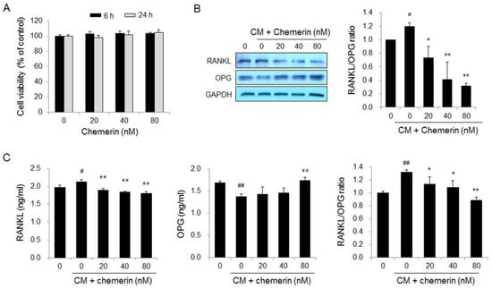 Metastatic breast cancer MDA-MB-231 cells induce osteolytic bone metastasis by promoting RANKL production in osteoblasts and the resulting osteoclastogenesis []. We investigated RANKL and OPG production in human osteoblastic hFOB1.19 cells treated with conditioned medium from MDA-MB-231 breast cancer cells and/or chemerin. Chemerin treatment for 6 h and 24 h did not affect the viability of osteoblastic cells (Figure 4A). Western blot analysis showed that treatment with the conditioned medium upregulated RANKL expression and downregulated OPG expression in osteoblastic cells. Chemerin treatment inhibited RANKL expression and increased OPG expression in osteoblastic cells treated with the conditioned medium (Figure 4B). Significantly elevated RANKL and decreased OPG levels were observed in the culture medium of osteoblastic cells treated with the conditioned medium of breast cancer cells. Chemerin treatment led to the recovery of the secreted levels of RANKL and OPG to control levels (Figure 4C). These results indicate that chemerin treatment blocks the increase in the RANKL/OPG ratio in osteoblastic cells stimulated with conditioned medium from MDA-MB-231 breast cancer cells, thereby preventing RANKL-induced osteoclastogenesis and breast cancer cell-associated bone loss.