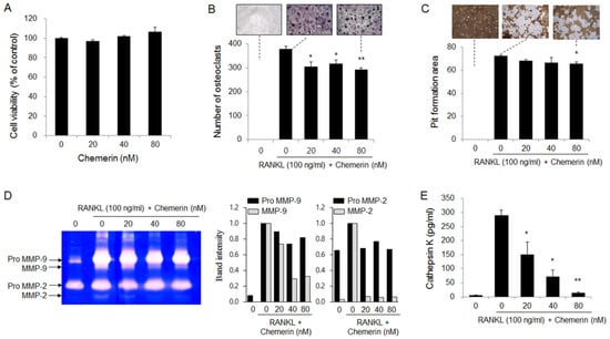 Osteolytic bone metastasis of breast cancer has finally been linked with osteoclast-mediated bone resorption []. RANKL treatment stimulated osteoclastogenesis and bone resorption in BMMs as osteoclast precursors. Chemerin treatment did not affect the viability of BMMs (Figure 5A) but significantly inhibited RANKL-induced osteoclast formation by 23% at 80 nM (Figure 5B). In addition, chemerin treatment slightly reduced the formation of resorption pits by mature osteoclasts on inorganic crystalline calcium phosphate-coated plates (Figure 5C) and inhibited the secretion of MMP-2, MMP-9 (Figure 5D), and cathepsin K (Figure 5E), which degrade the organic bone matrix. These results indicate that chemerin suppresses RANKL-induced osteoclast differentiation and the bone-resorbing activity of mature osteoclasts.