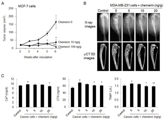 Chemerin suppressed tumor growth and breast cancer cell-associated bone loss in mice. (A) Tumor growth in mice inoculated with MCF-7 breast cancer cells in the presence of a β-estradiol pellet and then intraperitoneally administered with chemerin for 6 weeks. * p < 0.05, ** p < 0.01 versus MCF-7 cell-inoculated mice; (B) Representative radiophotographic and μCT 3D images of osteolytic lesions (dotted circles) and (C) serum levels of bone turnover markers in mice with intratibial inoculation of MDA-MB-231 breast cancer cells followed by intraperitoneal administration of chemerin for 5 weeks. # p < 0.05 versus control mice, * p < 0.05, ** p < 0.01 versus MDA-MB-231 cell-inoculated mice.
