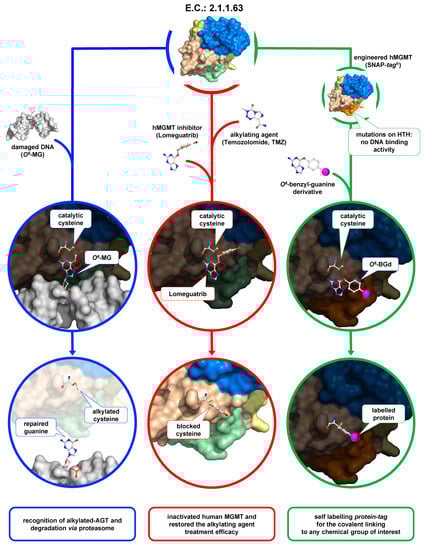 - Mollwitz, B.; Brunk, E.; Schmitt, S.; Pojer, F.; Bannwarth, M.; Schiltz, M.; Rothlisberger, U.; Johnsson, K. Directed evolution of the suicide protein O6-alkylguanine-DNA alkyltransferase for increased reactivity results in an alkylated protein with exceptional stability. Biochemistry 2012, 51, 986–994. [Google Scholar] [CrossRef] [PubMed]