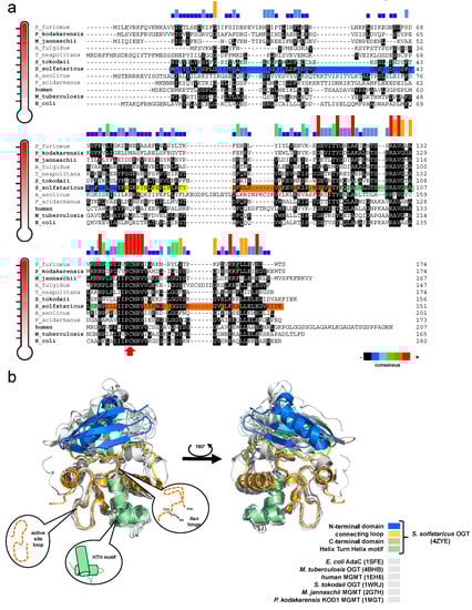 - Skorvaga, M.; Raven, N.D.; Margison, G.P. Thermostable archaeal O6-alkylguanine-DNA alkyltransferases. Proc. Natl. Acad. Sci. USA 1998, 95, 6711–6715. [Google Scholar] [CrossRef]