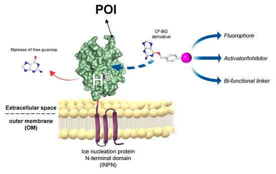 - Keppler, A.; Gendreizig, S.; Gronemeyer, T.; Pick, H.; Vogel, H.; Johnsson, K. A general method for the covalent labeling of fusion proteins with small molecules in vivo. Nat. Biotechnol. 2003, 21, 86–89. [Google Scholar] [CrossRef]