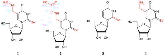 Presently known transfer RNAs contain more than 100 modified nucleosides, which constitute the vast majority of the 160 total modified units identified thus far in cellular RNAs. Approximately 50% of them are present at position 34 of tRNAs, also known as the wobble position of the anticodon [1,2]. They are involved in the fine-tuning of protein biosynthesis through modulation of codon–anticodon interactions and enhance the capability of tRNA to select the appropriate synonymous mRNA codon [3,4,5,6,7]. 5-Substituted uridines (R5Us), 2-thiouridines (R5S2Us) and 2-selenouridines (R5Se2Us) are the most widespread types of modified wobble nucleosides and are present in all three domains of life. To date, sulfur- and selenium-containing uridines have been found only in anticodons of tRNA iso-acceptors specific for glutamate, glutamine, and lysine [8]. Four selenium-containing uridines, namely, 5-methylaminomethyl-2-selenouridine (mnm5Se2U, 1), 5-carboxymethylaminomethyl-2-selenouridine (cmnm5Se2U, 2), 2-selenouridine (Se2U, 3), and 5-aminomethyl-2-selenouridine (nm5Se2U, 4), were identified in bacterial tRNAs (Figure 1), with mnm5Se2U (1) being the most abundant [1,9,10,11,12]. Se-containing tRNAs were also found in mammalian cells (mouse leukemia cells [13], bovine liver cells [14]), archaea (Methanococcus vannielii) [15,16], and plants (germinating barley [17], Chlamydomonas, wild carrot, tobacco, bamboo, and rice cells as well as mung bean and soybean seedlings [18]), although the exact locations of Se atoms have not been described thus far.