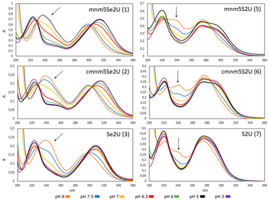 The effect of pH on the structure of 2-selenouridines 1–3 and their thio-precursors 5–7 was analyzed by UV spectroscopy. The UV absorption coefficients and absorbance maxima of 2-selenouridines (1–3) and 2-thiouridines (5–7) were assessed (Table 1). Both series of UV spectra for 1–3 and 5–7, which were acquired at increasing pH (from pH 3 to pH 8), differed significantly, as shown in Figure 2. The UV spectra of 2-selenouridines showed characteristic shifts of the absorbance maxima towards longer wavelengths at acidic, neutral, and basic pH in comparison to their 2-thio analogues (Figure 2, Table 1). However, both Se2- and S2-uridines exhibited the same maximum absorbance at 240 nm when the pH was changed from acidic to basic values. In the case of 5-substituted 2-selenouridines compared with 2-thiouridines, this peak exhibited higher absorbance and appeared at slightly lower pH.