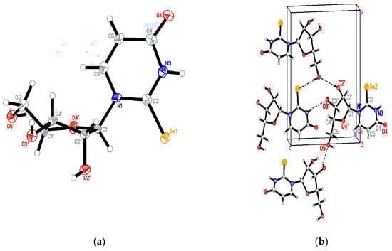 The molecular structure of 2-selenouridine (3) was determined by X-ray diffraction analysis (Figure 3). The Oak Ridge Thermal Ellipsoid Plot (ORTEP) drawing of Se2U is presented in Figure 3A. Selected crystallographic data for Se2U in comparison with S2U [59] and U [60] are given in the Supplementary Materials (Tables S1–S6). The Se2U nucleoside crystallized in one of the typical crystallographic space groups for chiral compounds, namely P21, with one molecule in the asymmetric unit (Table S1). The crystal packing, reflected in the unit cell dimensions with a relatively short a axis, was stabilized by four intermolecular hydrogen bonds (Figure 3B, Table S2). The geometry of the 2-selenouracil heterobase moiety of Se2U was slightly changed in comparison to those of the 2-thiouracil or uracil residues in the S2U [59] and U structures [60]. The Se atom was displaced out of the heterobase ring plane by 0.234 Å, while the S atom in S2U and the O atom in U exhibited planar alignments (Table S2). The length of the C2-Se bond (1.851(8) Å) in the Se2U molecular structure corresponds to neither a pure C=Se bond (1.74 Å) nor a single C-Se bond (1.94 Å) [61]. The selenol tautomer (C2-SeH), however, was rejected by crystallographic refinement; when hydrogen was modeled in place of the higher residual peak in the vicinity of the selenium atom and removal of the N3 hydrogen, the refinement parameters increased significantly.