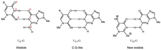 Regarding the specificity of hybridization, uridines in the RNA chain preferentially recognize A by Watson–Crick interactions and, with lower affinity, read G complements by wobble hydrogen bond patterns [37]. Introduction of sulfur or selenium atoms at position 2 of uridine enhances the thermodynamic stability of RNA duplexes with X2U–A base pairs and restricts the formation of X2U–G base pairs (X = S or Se); this effect is more pronounced for Se2U than for S2U models [29]. In contrast to the above results of thermodynamic measurements, biological experiments demonstrated that synonymous mRNA codons with 3′-A- and 3′-G-ending units are equally well recognized by tRNAs with anticodons containing wobble modified uridines, especially those containing sulfur at position 2 and bearing specific substituents at position 5 [20,38,39]. Recent data suggested that in a biological context (e.g., tRNA bound to mRNA at the ribosome), modified uridine 34 units (U*34) can recognize guanosine units by at least two different hydrogen bonding patterns, depending on the substituents at positions 2 and 5 of the uracil ring [40,41,42,43,44,45]. While U*34–G base-pairing data are available for 5-substituted uridines and 2-thiouridines, data for corresponding 5-substituted 2-selenouridines identified in tRNAs are limited [46,47].