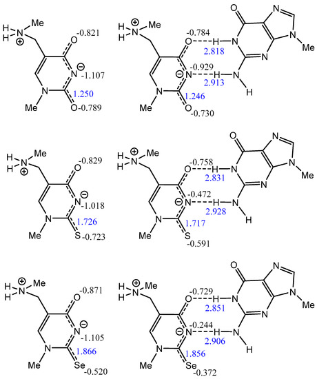 Comparison of selected electrostatic potential-derived (ESP) atomic charges and distances in zwitterionic m1mnm5Ura, m1mnm5S2Ura, and m1mnm5Se2Ura and in their complexes with 9-methyl guanine (m9Gua) in water; bond distances are marked in blue. The data were taken from Figure S30 and ref. [45].