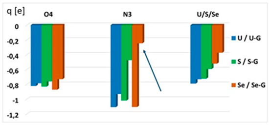 To understand the differences between the selenium, sulfur, and oxygen models, the changes in ESP atomic charges on the O4, N3, and X2 atoms in the X2-C2-N3-C4-O4 bonding region of the zwitterionic m1mnm5X2Ura (X = O, S, Se) were analyzed before and upon formation of the base pair with m9Gua [45]. The corresponding charge distributions on the free and bound forms of 2-oxo-, 2-thio-, and 2-seleno-uracils, presented in Figure 5 (data withdrawn from Figure S30 and ref. [45]), were compared and are displayed in Figure 6. This graph shows the change in atomic charges at the O4, N3, and chalcogen atoms (in blue, green, and brown for m1mnm5Ura, m1mnm5S2Ura, and m1mnm5Se2Ura, respectively) in the form of two neighboring bars, where the left bar represents the charge before and the right bar represents the charge after the binding to the G partner. While the changes in negative charge on O4 and the chalcogen atom increased gradually upon binding, a dramatic charge transfer was observed at the nitrogen atom of the selenium-modified base (indicated by an arrow), much bigger (Δq = 0.861e) than those observed in the sulfur-modified base (Δq = 0.546e) and in the uracil base (Δq = 0.178e). Moreover, the length of the hydrogen bond N3…HN2 in the models of Se2U-G base pair was shorter than the same hydrogen bond in the corresponding S2U–G and U–G base pairs (Figure 5).