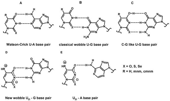 The combination of a sulfur atom in position 2 and an electron-withdrawing or electron-donating side chain in position 5 promotes various tautomeric forms of uracil, i.e., a 2,4-diketo form (K in Figure 7A,B), an E4 tautomer (Figure 7C), or a zwitterionic ZI form (Figure 7D). This “chameleon” ability explains how R5S2U hybridizes with an A complement (the K form) and a G complement (K, E4, or ZI forms) [44]. The latter modes (E4 and ZI) were previously demonstrated in the crystal structures of mcm5S2U34-tRNA (UE4-G) and mnm5S2U-tRNA (UZI-G) bound to mRNA models accommodated at the ribosome [41,43], and were confirmed by physicochemical and theoretical studies [45]. In RNA duplexes, R5U/R5S2U can also recognize G units through the wobble mode (Crick hypothesis, Figure 7B) [74], although this spatial arrangement is not permitted by the ribosomal architecture [75].