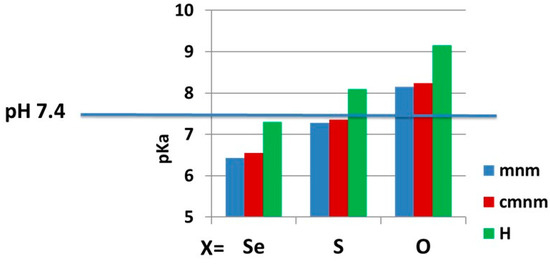 We hypothesize that the prevailing content of ZI forms of 1 and 2 ensure the recognition of the 3′-G-ended mRNA codons and that these Se2U-G base pairings are stronger than the S2U-G pairings delivered by 5 and 6; this was previously confirmed by functional studies [47]. Similarly, 5 and 6, besides improved reading of A, can also read G units [45]. C5-Modified Us recognize 5′-NNA-3′ codons well, according to Watson–Crick base pairing. This “ranking” (order of appearance) is in accordance with our earlier observations, demonstrating that UZI-G base pairing decreases in the order Se2U > S2U > U. However, the exceptions are wobble uridine τm5U and 2-thiouridine τm5S2U (containing a taurinomethyl C5-side chain), which exhibit pKa values of 7.51 and 7.10, respectively, i.e., much below the values for modified uridines 8 and 9, but similar to those found for 5 and 6. These taurine modifications are supposed to allow for the reading of both A and G units in synonymous mRNA codons, while their absence causes discriminate reading of G-ended codons and results in mitochondrial genetic disorders called MEERF and MELAS [71,73].