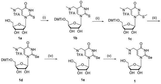 Synthesis of 5-methylaminomethyl-2-selenouridine (1). Reagents and conditions: (i) DMTr-Cl, pyridine, rt, overnight, 92%; (ii) MeI, Et3N, EtOH, rt, 2h, 90%; (iii) Se, NaBH4, EtOH, 2 h, 0 °C to generate NaSeH, then rt, 2.5 h, 60%; (iv) 50% aq. AcOH, 1.5 h, rt, 70%; (v) 30% aq. ammonia, 15 min, rt, 83%. TFA: trifluoroacetyl; DMTr: 4,4′-dimethoxytrityl.