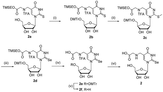 Our syntheses of mnm5Se2U (1) (Scheme 1) and cmnm5Se2U (2) (Scheme 2) began with the 5-substituted 2-thiouridines 1a and 2a, respectively. 5-Methylaminomethyl-2-thiouridine (1a) with N-trifluoroacetyl (TFA) protection of the amine functional group at the 5-position and 5-carboxymethylaminomethyl-2-thiouridine (2a) with N-TFA protection and a 2-(trimethylsilyl)ethyl (TMSE) ester-type protecting group on the carboxylic function were obtained according to previously described procedures [48,49,50,51,52]. Before the S-alkylation step, substrates 1a and 2a were subjected to 5′-O-dimethoxytritylation and treated with methyl iodide in the presence of triethylamine in ethanol to obtain S-methylated 2-thiouridines 1c and 2c in yields of 90% and 80%, respectively. The S-methylated derivative of mnm5S2U (1c) was subsequently treated with NaSeH (10 equivalents (equiv.)) prepared via a sodium borohydride reduction of elemental selenium (15 equiv.) in EtOH according to the procedure originally elaborated by Klayman and Griffin [53] and utilized by Huang’s and Davis’s groups to prepare 2-selenated thymidine and uridine phosphoramidites [29,30,54]. Since seleno-compounds are sensitive to oxygen, all the reactions were conducted under an argon atmosphere. In our work, the selenation of S-methylated mnm5S2U 1c was performed at room temperature for 2.5 h, yielding 60% 2-selenouridine 1d. The use of a higher excess of NaSeH (12 equiv.) in the reaction with S-methylated cmnm5S2U 2c resulted in complete selenation after 1 h (TLC control), and the seleno-compound 2d was isolated in a yield of 84% after purification by flash column chromatography using argon overpressure.
