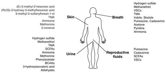 The body can emit odorous substances (odorants) with breath, saliva, sweat (skin), urine or reproductive organs fluids. The major odorants are small, volatile compounds that may either be produced in situ (skin, oral cavity) or be carried by blood from the gut, which is a major site of bacterial metabolism. Main bacterial odorants and their emission sites are presented in Figure 1.