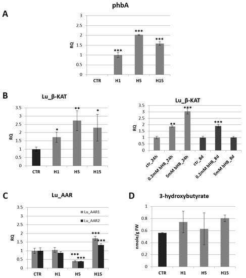 The mRNA level of bacterial beta-ketothiolase (phbA) in transgenic flax plants (H1, H5, H15). Changes in mRNA levels are shown as the relative quantity (RQ) relative to the reference gene (actin) in comparison with the expression in H1 plants, where it was the lowest. Non-transgenic control lines (CTR) showed not phbA gene expression. The results were obtained via PCR on cDNA, subsequent electrophoretic separation of obtained products and the densitometric measurement of bands (A). The mRNA level of endogenous beta-ketothiolase in transgenic flax lines H1, H5, H15 in comparison with non-transgenic flax (CTR) and in flax treated with the beta-hydroxybutyrate standard at concentrations of 0.2 mM and 5 mM during 24 h and 8 days in relation to non-treated flax (CTR) (B). The mRNA level of acetoacetyl-CoA reductases in transgenic flax lines H1, H5, H15 in relation to non-transgenic flax (CTR). The mRNA level of Lu_AAR1, Lu_AAR2 (acetoacetyl-CoA reductases) in transgenic flax in comparison with non-transgenic flax (CTR) was obtained from real-time RT-PCR analysis. Actin was used as a reference gene and the transcript levels were normalized to those of the control plant (CTR). RQ: relative quantity (C). Content of beta-hydroxybutyrate in 5-week-old plants (stems and leaves) from in vitro culture of transgenic flax lines H1, H5, H15 and in non-transgenic flax (CTR) determined using the GC-MS technique (D). The results are presented as mean values of three independent repeats ± SD. Statistically significant differences are marked with asterisks (*—p < 0.05, **—p < 0.01, ***—p < 0.001).
