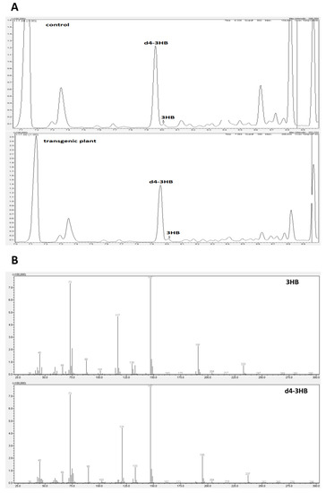 Composition analysis of extracted material from control and transgenic flax with the identification of 3-hydroxybutyrate (3-HB) by GC-MS. (A): Counts vs. acquisition time (min) for control (upper panel) and transgene (down panel). (B): Counts vs. mass charge ratio (m/z) for 3-HB (upper panel) and deuterated 3-HB (down panel).