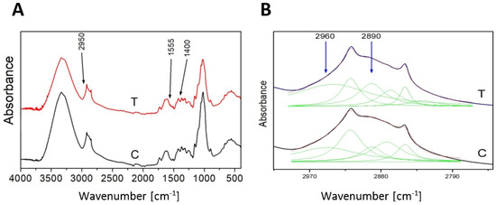 FT-IR spectrum of control (C) and transgenic sample (T) as an example (A). The deconvolution of the contour 2800–3000 cm−1 into the Lorentz components (B).