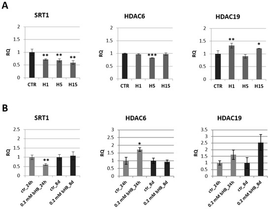 Expression of histone deacetylases in transgenic flax plants (A) and in flax treated with 3-HB (B). The mRNA level of sirtuin 1 (SRT1) and other histone deacetylases (HDAC6, HDAC19) in transgenic flax or in plants treated with the beta-hydroxybutyrate standard at concentrations of 0.2 mM during 24 h and 8 days in comparison with control (CTR) was obtained from the real-time RT-PCR analysis. Actin was used as a reference gene and the transcript levels were normalized to those of the control plant. RQ: relative quantity. The results are presented as mean values of three independent repeats ± SD. Statistically significant differences between the means were marked with asterisks (*—p < 0.05, **—p <0.01, ***—p < 0.001).