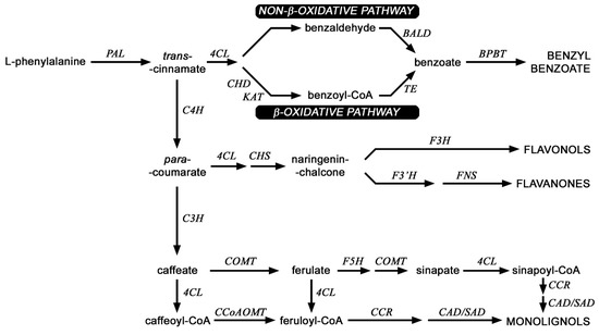 Scheme of selected routes of phenylpropanoid pathway in flax. PAL (phenylalanine ammonia lyase), C4H (cinnamic acid 4-hydroxylase), C3H (4-coumarate 3-hydroxylase), CCR (cinnamoyl-CoA reductase), F5H (ferulate 5-hydroxylase), SAD (sinapyl alcohol dehydrogenase), CAD (cinnamyl-alcohol dehydrogenase), COMT (caffeic acid 3-O-methyltransferase), CCoAOMT (caffeoyl-CoA O-methyltransferase), CHS (chalcone synthase), 4CL (4-coumarate-CoA ligase); KAT (b-ketothiolase), CHD (cinnamoyl-CoA hydratase-dehydrogenase) BALD (benzaldehyde dehydrogenase), TE (thioesterase), BPBT (benzyl alcohol O-benzoyltransferase), F3H (flavanone 3-dioxygenase), F3′H,flavonoid-3′-hydroxylase), FNS (flavone synthase).