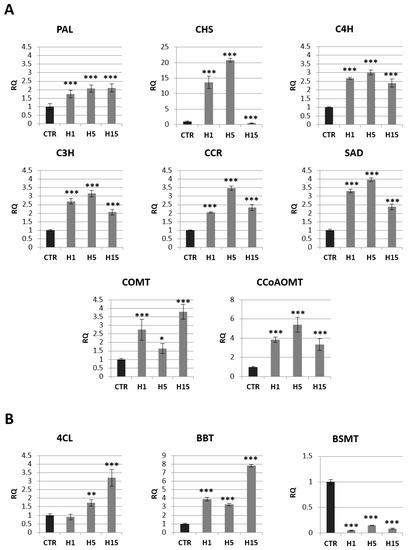 The mRNA level of selected genes involved in phenolic acids and lignin route: PAL, CHS, C4H, C3H, CCR, COMT, CCoAOMT, SAD (A), and benzoic acid route: 4CL, BBT, BSMT (B) in transgenic flax plants (CTR). The mRNA level of PAL (phenylalanine ammonia lyase); CHS (chalcone synthase); C4H (cinnamic acid 4-hydroxylase); C3H (4-coumarate 3-hydroxylase); CCR (cinnamoyl-CoA reductase); SAD (sinapyl alcohol dehydrogenase); COMT (caffeic acid 3-O-methyltransferase); CCoAOMT (caffeoyl-CoA O-methyltransferase); 4CL (4-coumarate-CoA ligase); BBT (benzyl alcohol O-benzoyltransferase); BSMT (benzoic acid/salicylic acid methyltransferase) in transgenic flax in comparison with control plants (CTR) was obtained from the real-time RT-PCR analysis. Actin was used as a reference gene and the transcript levels were normalized to those of the control plant. RQ: relative quantity. The results are presented as mean values of three independent repeats ± SD. Statistically significant differences between the means were marked with asterisks (*—p < 0.05, **—p < 0.01, ***—p < 0.001).