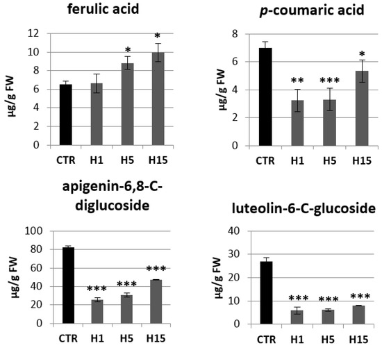 The levels of selected phenolics (ferulic acid, p-coumaric acid, apigenin-6,8-C-diglucoside, luteolin-6-C-glucoside) of the phenylpropanoid pathway in transgenic flax plants. Content of selected phenolic compound in 5-week-old plants (stems and leaves) from in vitro culture of transgenic flax lines H1, H5, H15, and control flax (CTR). The content of metabolites was obtained from the UPLC analysis. Calculations were performed using MassLynx software. The results are presented as mean values of three independent repeats ± SD. Statistically significant differences between the means were marked with asterisks (*—p < 0.05, **—p < 0.01, ***—p < 0.001).